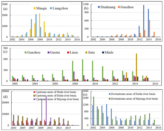 The statistics on the time that NDVI began to decrease in different counties of Wuwei Prefecture (a), Jiuquan Prefecture (b), and Zhangye Prefecture (c); and the statistics on time that vegetation conditions began to improve in the upstream areas (d) and the downstream areas (e) of the river basins. Values in the Y axes of each histogram were the number of pixels in each individual year. Only the pixels where vegetation changes were driven by the factors associated with human activities (Figure 9) were counted in the histograms.