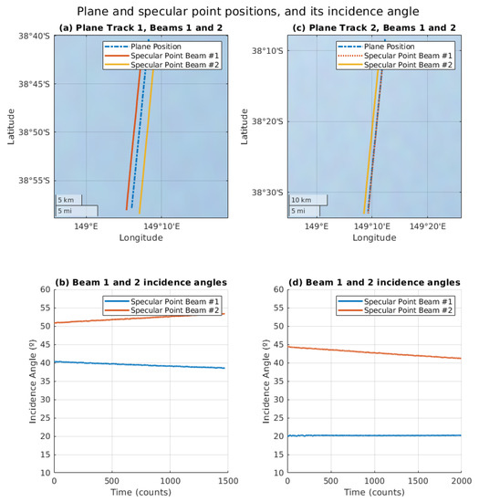 Top frame—plane position and specular point position of Track 1 (a) and Track 2 (c). Bottom frame—incidence angle to the specular point of Track 1 (b) and Track 2 (d). The plane positions correspond to the white frame box in Figure 2. Note that, the plane position and specular point of Beam 1 of Track 2 are superposed due to the very low incidence angle (i.e., almost nadir).