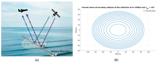 The reflection scenario is illustrated in Figure 4. Note that, the semi-radius of the ellipse formed by the first Fresnel zone [17] (i.e., the area that contains the specular reflection) in the described scenario is limited by the plane altitude as shown in Equation (2).