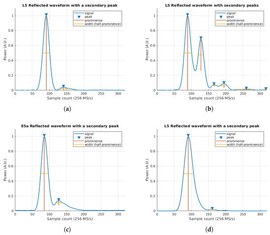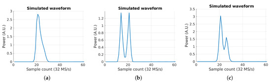 In order to illustrate this concept, three simulated waveforms are computed with different c coefficients. In the first example, using a reflection scenario is computed with lots of small contributions from all the Fresnel zones near the specular point. This produces a waveform as in Figure 6a, where the power decreases, and no secondary peaks are found. However, using produces two identical peaks which are easily distinguished. Note that, the separation between the peaks in samples is seven samples. In order to convert the sample distance into a tangible magnitude, the same method as in Equation (10) from [9] is used here in Equation (4).
