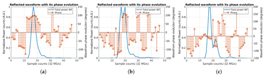 In this section, three consecutive measured waveforms (see Figure 7) have been selected to illustrate these effects. The separation in time between each waveform is 600 ms, and they have been selected because of their similitude to the ones simulated in the previous section. Note that, the three selected waveforms are from Track 1 Beam 1, and both amplitude and phase evolution of the waveform are shown.
