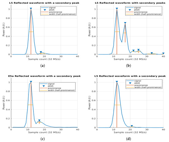 In this case, second and third reflections occurring in consecutive wave crests in the first Fresnel zone produce different signal wave fronts that are added constructively or destructively in the receiver antenna. However, thanks to the large bandwidth, and hence the very narrow auto-correlation [18] function of the L5/E5a GNSS signal (i.e., 30 m in space), reflections from nearby crests with a distance between them larger than 30 m can produce second peaks in the retrieved waveform.