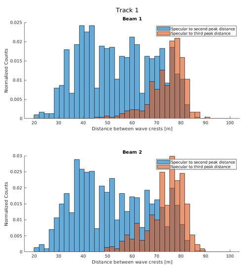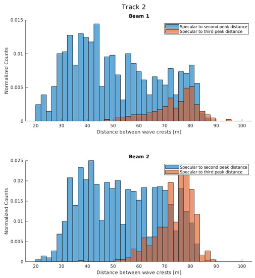 A similar behavior is also found in Track 2, as shown in Figure 13. The Galileo signal (i.e., Beam 1), has a mean value ∼50 m, and Beam 2 a mean value on the order of m, as in Track 1. Note that, a large portion (∼ 40%) of the Beam 1 reflections do not have a secondary peak because of the reflection geometry. As the incidence angle is very close to 0° (i.e., very close to nadir), the possible reflections are coming from closer wave crests, therefore the receiver is only able to infer consecutive crests which are closer one to each other.