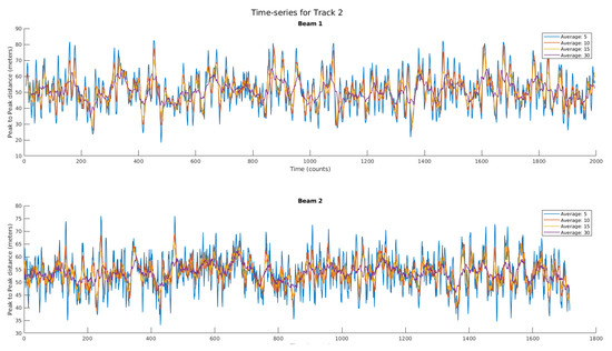 In order to reduce the noise of the measurement, four different averaging windows have been applied to the peak-to-peak distance. In this case, the averaging selected is 5, 10, 15, and 30 samples. As seen in Figure 12, this wavy behavior is clearly identified in the measurement, which is present even with large averaging windows. As seen with the highest averaging time, the mean of the crest-to-crest distance is ∼55 m for Beam 1, and ∼52.5 m for Beam 2. As seen in [14,19], the average wave period, or the average wavelength, , tends to the combination of all the different wave contributions.