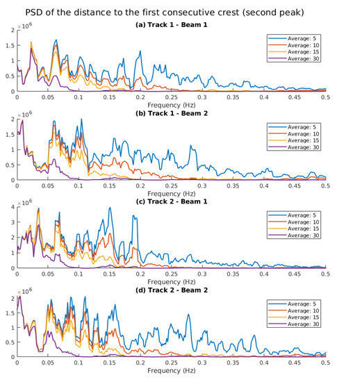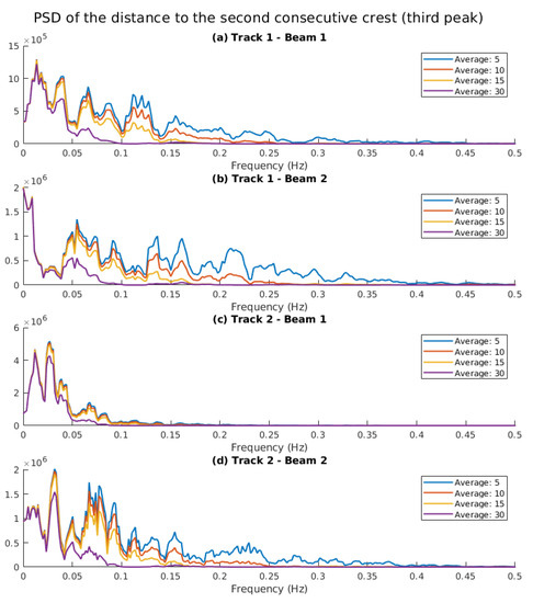 In order to do that, the power spectral density of the time-series data from previous section is computed. Figure 14 shows the power spectral density of the distance to the second peak (or the first encountered crest in the sea wave surface). In all four figures, there are some common frequencies at ∼0.06 Hz, 0.1 Hz, 0.15 Hz, and also a 0.2 Hz component in Beam 1 of both Tracks 1 and 2.