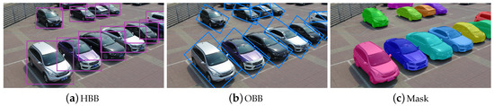 Previous detection methods are mostly based on horizontal bounding box (HBB), including Faster region-based convolutional networks (Faster R-CNN) [5], Grid R-CNN [6], Light-Head R-CNN [7], You Only Look Once (YOLO) [8], Fully Convolutional One-Stage Object Detection (FCOS) [9], etc. These HBB methods usually contain a lot of background pixels when detecting vehicles with arbitrary orientations, which is shown in Figure 1a.