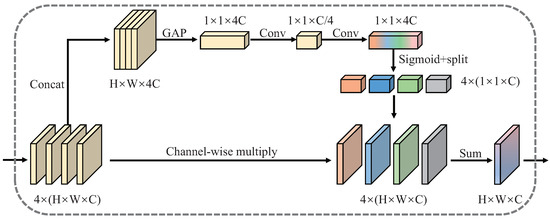 where, represents concat operation along channel dimension, . Then, the Global Average Pooling (GAP) function is performed on to get global information as . Thus the j-th channel of is calculated by:
