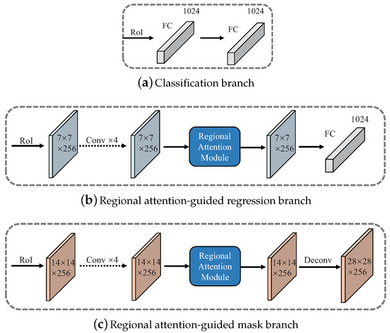 As shown in the right of Figure 4, RoIs firstly go through a RoIAlign [19] layer to do normalization resulting the fixed sizes. Then these RoIs with fixed sizes are sent to sub-net of head network respectively. Distinguished from the head network of Mask R-CNN [19], the proposed RATH-Net has three sub-networks working independently, including a classification branch, a regional attention-guided regression branch, and a regional attention-guided mask branch. The RAM and three branches of RATH-Net are described as follows.
