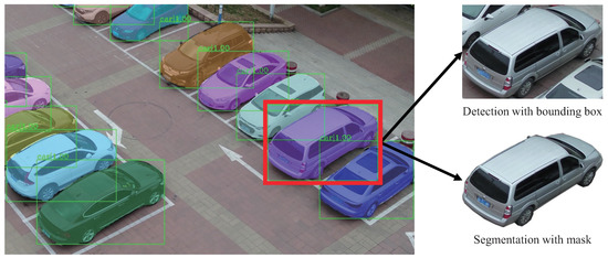 Comparison of our vehicle segmentation and detection. For this vehicle, approximately region in the bounding box is from the background, whereas the region in the mask contains almost no background.