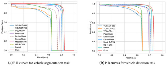 With fixed and , different recall and precision values can be obtained by changing the confidence score thresholds for segmentation and detection. The P-R curves of different methods for vehicle segmentation are plotted in Figure 11a. The P-R curves of different methods for vehicle detection are plotted in Figure 11b. The curve of our proposed method has a larger area than that of other methods in the segmentation task and the detection task. When the recall is specified, the precision of MSOA-Net is higher than other compared methods. When the precision value is given, the recall of MSOA-Net is higher than other compared methods. Hence, it can be concluded that the proposed MSOA-Net has better performance than other compared methods.