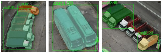 In Figure 13, we list some typical failure predictions of our method. As shown in Figure 13, our method misses some vehicles and mistakenly treats the detected closely adjacent vehicles as a whole. One possible reason for this case is that these vehicles such as trucks and buses rarely appear in the training set of UVSD. In the meantime, these crowded vehicles have similar appearance features. If more training samples are provided, the detection and segmentation can still be performed hopefully.