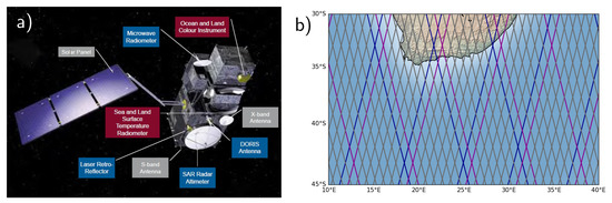 (a) Illustration of Sentinel-3 spacecraft showing most of the equipment payload (image courtesy of ESA). (b) Example of track pattern (all lines) surveyed by Sentinel-3A in 27 days in the Agulhas region, South Africa. Blue lines show the nearly uniform coarser coverage from a 4-day period (sub-cycle), with magenta lines showing the subsequent 4 days. [Left-hand figure taken from [2]].