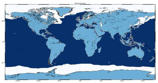 Land/Sea mask showing the regions of responsibility for data production for mid 2020 onwards (expected). Data over land (light blue) are produced and disseminated by ESA; those over the ocean (dark blue) by EUMETSAT; some regions (white) are common to both, including the polar regions of maximal sea-ice extent and major inland water bodies (e.g., Caspian Sea, Great Lakes, Lake Victoria). As users for terrestrial data may benefit from the records just offshore, and those working in the coastal zone benefit from having the data just inland, these regions extend 25 km outward/inward from the coast to avoid researchers needing to gather data from two sources.