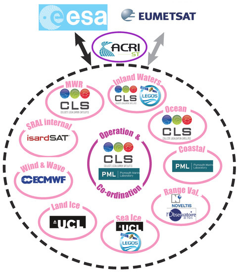 There are many complicated challenges in assessing the quality of Sentinel-3 STM data over a variety of surfaces, operating at two frequencies (Ku- and C-band) and using two different tracking modes (OL and CL) and assessing the different latencies. The European Community, through its Copernicus programme, funded the development of the Sentinel-3 Mission Performance Centre (S3MPC). The main goal of the S3MPC is to provide focussed effort on the assessment of the whole mission performance, thus including all measurements recorded by the satellites as well as the derived geophysical values emanating from the processing chains on the ground. The S3MPC has different components covering the various sensors. Each component has many Expert Support Laboratories (ESLs) that provide dedicated expertise in specific areas. The groups involved in the STM component are shown in Figure 3, congregated according to their areas of work.