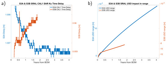 S3A and S3B whole mission series of calibration parameters correcting science range measurements: (a) calibration path time delay, and (b) range delay due to not-nominal Ultra-Stable Oscillator frequency.