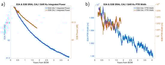 Complete mission series of S3A and S3B SRAL instrumental corrections for (a) emitted power, and (b) CAL1 PTR width.