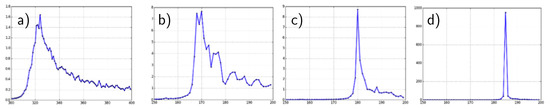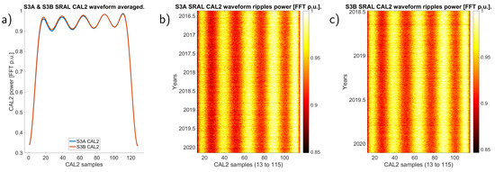 The transfer function depicts the altimeter signal distortions within the observation window, caused by the imperfect behaviour of the altimeter electronics and on-board processing. The CAL2 ideal shape is a rectangle, unitary in the band of frequencies of interest, but it actually shows ripples, caused by the cut-off anti-aliasing filtering stage [7,15]. The CAL2 ripples, usually observed in other altimeters, are shown in Figure 7a. The stability of this shape during the mission is shown in Figure 7b,c for S3A and S3B. The CAL2 waveform features, such as sides slopes and standard deviations are maintained in both missions. The correction is continuously updated, and the science measurements are compensated by an averaged CAL2 over a number of previous days.