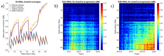 AutoCal calibration mode produces an array that is used for correcting for the difference between the commanded attenuation and the actual attenuation applied to the signal on-board. Moreover, this correction can drift in the long term, and an updated in-flight mission-averaged AutoCal table will be used from 2020. Figure 8a depicts the averaged attenuation correction tables for the two bands and missions, where the curves show the delta between the corrected and reference attenuations. Different schemes can be developed for achieving the different desired attenuations, and this is the reason why both missions have completely different shapes, but more similar between bands for a mission. Figure 8b,c illustrate respectively the correction progression for S3A and S3B missions: S3B shows higher differences during the mission.