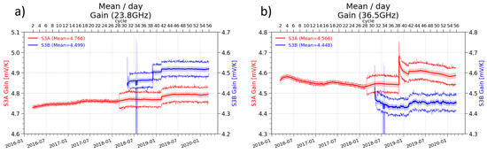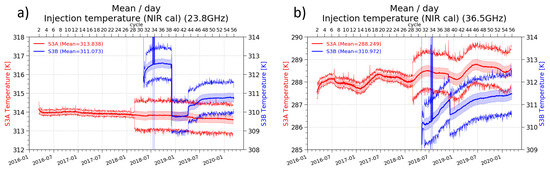 Daily noise injection temperatures for S3A (red) and S3B (blue). Bold lines show the average, shades the standard deviation and lighter lines are minimum/maximum values. (a) 23.8 GHz channel (b) 36.5 GHz channel.