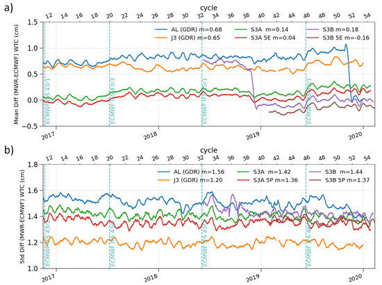 Comparison of MWR-derived corrections with those from ECMWF model. (a) Mean WTC difference (b) S.D. WTC difference. The vertical lines in cyan indicate changes in the ECMWF operational model used as the reference. Note, there was an update to the S3B characterization file in Dec. 2018, and the default AltiKa algorithm changed from 3-parameter to 5-parameter in Dec. 2019.