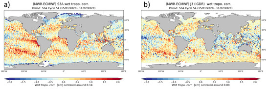 Geographical variation of WTC bias (MWR-derived correction minus those from ECMWF model. (a) S3A, with a mean bias of 0.14 cm removed (b) Jason-3 MWR for the same period, with 0.80 cm removed.