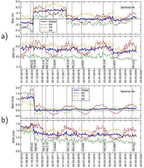 Radar backscatter (), surface wind speed (WS) and significant wave height (SWH) from the marine Level-2 product S3A_SR_2_WAT are monitored and validated using the procedure successfully applied to equivalent products from earlier altimeters (Jason-2 [21], SARAL-AltiKa [22] and CryoSat-2 [23]). The procedure, which is based on Abdalla and Hersbach [24], is described in Appendix A of any of the “Wind and Wave” issues of Sentinel-3 Cyclic Reports [13]. It consists of a set of self-consistency checks and comparisons against other sources of data. Model equivalent products from the ECMWF Integrated Forecasting System (IFS) and in situ measurements available in Near Real-Time (NRT) through the Global Telecommunication System (GTS) are used for the validation.