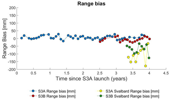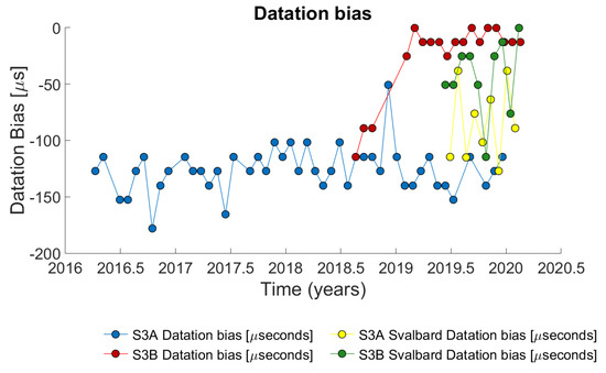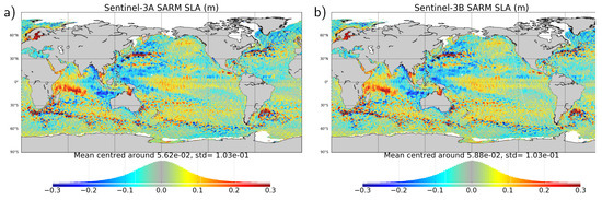 Figure 4 shows the calibration parameters that are accounted for in the science range measurements: CAL1 Delay (a) and USO frequency (b). For the CAL1 Time Delay, we observe similar absolute values close to 1 m internal delay and opposite drifts: −0.3 mm/year for S3A and 0.7 mm/year for S3B. For comparison, CryoSat-2 and Envisat missions delay drifts are respectively about 0.3 and 1 mm/year. The USO frequency correction in terms of range is of the same order of magnitude for both missions: 4.4 mm/year for S3A and 1.8 mm/year for S3B.