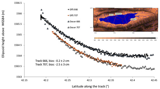 - Crétaux, J.F.; Calmant, S.; Romanovski, V.; Perosanz, F.; Tashbaeva, S.; Bonnefond, P.; Moreira, D.; Shum, C.K.; Nino, F.; Bergé-Nguyen, M.; et al. Absolute calibration of Jason radar altimeters from GPS kinematic campaigns over Lake Issykkul. Mar. Geod. 2011, 34, 291–318. [Google Scholar] [CrossRef]