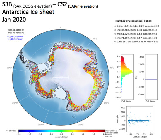 - McMillan, M.; Muir, A.; Shepherd, A.; Escolà, R.; Roca, M.; Aublanc, J.; Thibaut, P.; Restano, M.; Ambrozio, A.; Benveniste, J. Sentinel-3 delay-Doppler altimetry over Antarctica. Cryosphere 2019, 13, 709–722. [Google Scholar] [CrossRef]
