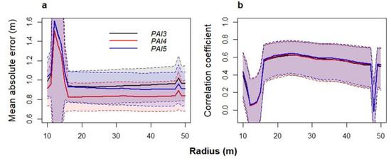 3.1. Correlation and MAE as a Function of Lidar Radius