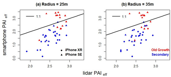 Relationship between smartphone and lidar PAIeff (using the four-ring smartphone PAIeff estimation method) assuming a spherical leaf angle distribution and using a radius of (a) 25 m and (b) 35 m in the lidar close points calculation.