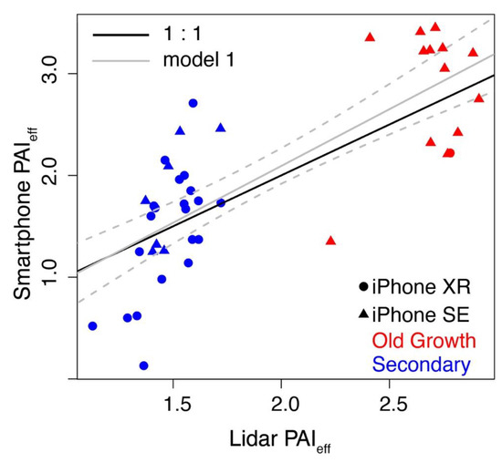 Our final comparison of lidar and smartphone PAIeff used the optimal lidar radius and LADs determined above. Additionally, we tested for residual bias caused by differences between smartphone models and unaccounted for difference between old growth and secondary forests by comparing four linear models: