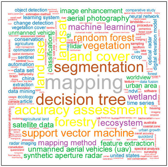 From a search of the Scopus database (title/keyword/abstract search for papers containing the term “object-based image analysis”), we identified 369 journal articles published on the topic of GEOBIA over the last two years (2018–2019). From these articles, we attempted to highlight some topics of significant recent interest based on the text in the papers’ titles/keywords/abstracts. High-frequency terms from the text were identified using Citespace software [8], and after filtering out several overly general terms (e.g., “object”, “based”, “image”, “analysis”, “remote sensing”, and “resolution”), a wordcloud map (Figure 1) was generated to allow for a visualization of the frequently-used terms (larger words in the figure were more frequently used). In Figure 1, mapping and segmentation can be seen as the most frequent areas of interest overall, which is perhaps unsurprising. The types of applications GEOBIA was most frequently used to support can be seen as forestry, vegetation, wetland, and urban area analysis. Classification algorithms that were of significant interest included decision trees (which are often incorporated in ensemble algorithms like random forests [9]) as well as support vector machines [10]. Finally, the most frequent remote sensing datasets of interest included Landsat images, synthetic aperture radar (SAR) data, Worldview images, Sentinel images, images from UAVs/other airborne optical sensors, and Lidar data. This frequent interest in moderate spatial resolution imagery (e.g., Landsat and Sentinel) as well as SAR/Lidar data suggests that GEOBIA has moved beyond its initial sole focus on high-spatial-resolution optical data.