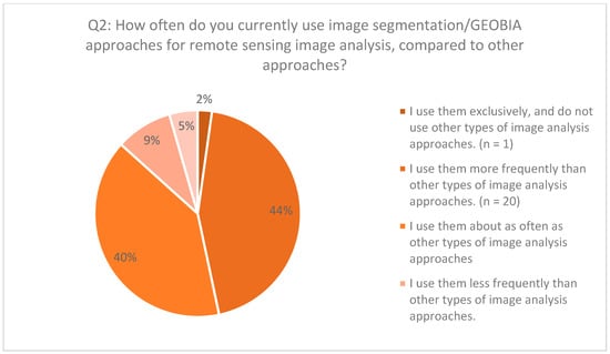 Invitations to participate in the survey were sent by email in March 2020, and we received 45 responses in total. The number of years that the respondents had been using GEOBIA approaches (Q1) ranged from 1–20, with an average of 7.18 years (Figure 2). Around half (46%) of the respondents reported that they used GEOBIA approaches more frequently than other remote sensing image analysis approaches, and another 40% used them about as frequently as other approaches (Q2) (Figure 3). The responses to these two questions suggest that survey respondents were generally quite experienced in the use of GEOBIA.