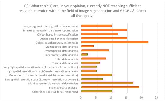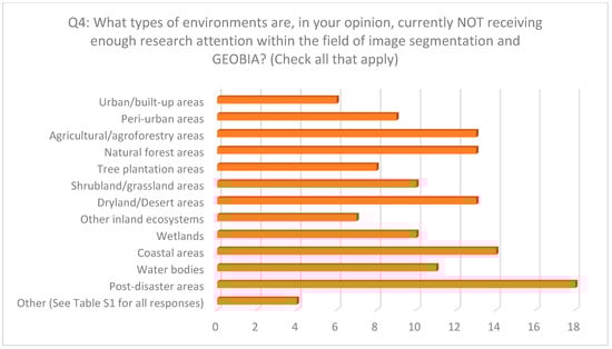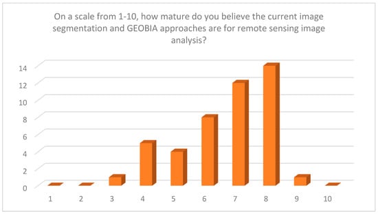 Among the topics within GEOBIA that were currently not receiving sufficient research attention (Q3), object-based accuracy assessment was the most frequently noted (by 22 respondents), followed by big image data analysis (indicated by 19 respondents), and multi-sensor/multi-temporal data fusion (indicated by 17 respondents) (Figure 4). The latter two topics may be particularly important in the context of the growing archives of free high and moderate spatial resolution satellite data provided by different countries’ space programs. Among the types of environments that were currently not receiving sufficient research attention (Q4), post-disaster areas was the most frequently indicated (by 18 respondents), followed by coastal areas (indicated by 14 respondents) (Figure 5). Interestingly, urban/built-up areas were least frequently indicated for this question, suggesting a potential oversaturation of urban GEOBIA studies. Finally, in response to Q5, the majority of respondents perceived the current image segmentation and GEOBIA approaches as already having received a relatively high level of maturity (i.e., value of 7 or 8 on a scale from 1 (“They are still at a very early stage of development”) to 10 (“They are already good enough, and little-to-no further improvements are required.”)) (Figure 6). That said, several remaining weaknesses of GEOBIA were pointed out in response to Q6.