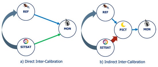 In the simplest case, shown by the green arrow in Figure 1a, such a SITSAT can be used as a reference in direct inter-calibration of the monitored instrument by SNO or Ray-matching instead of the current reference instrument(s) for the IR case, or the PICTs in the VIS/NIR case. However, the coverage of the available collocated observations can be limited, depending on the design of the SITSAT—and the duration of such inter-calibration products is limited to its operating lifetime.