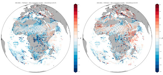 Difference of Tropospheric Humidity (THU) product derived from SEVIRI’s WV7.3 channels of Meteosat-8—Meteosat-10 at 12:45Z on 20 Nov 2016 before GSICS Correction (left) and after GSICS Correction (right).