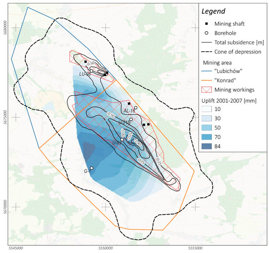 - Milczarek, W.; Głowacki, T. Secondary Surface Deformations of Former Mining Areas. Min. Sci. 2013, 20, 39–55. [Google Scholar] [CrossRef]