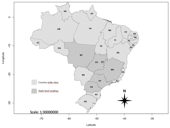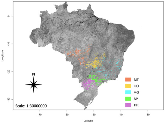 In Brazil, agriculture represents almost a quarter of the country GDP’s, 24.1% in 2017 [31]. According to the Brazilian Institute of Geography and Statistics (IBGE) rural census [32], the harvested area during the 2016/2017 season represented 7.9% of the total area with 73,797,057 hectare (ha) dedicated for temporary and semi-temporary crops and another 5,184,813 ha for permanent crops, with the final results published in 2019. For the purpose of this study, detailed statistics of the studied areas are summarized on the Table 1. The column “Total” shows the total area (country/State). The column “Agriculture” presents the harvested area (country/State). It is important to highlight that, due to geographical and environmental conditions, which include climate and/or technologies (e.g., irrigation), it is common to have multiple crops per year in tropical areas. Therefore, the conclusion is that the harvests are larger than the total area dedicated to agriculture, a total of 67,547,537 ha according to EMBRAPA [33,34] and MAPA [35].