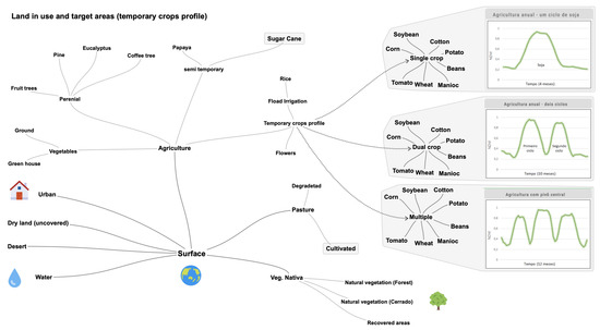 The use of expert knowledge management based on ontology process to support the collective understanding of a single event (Data driven approach) was applied to proper address crop growing season specifics to expand the comprehension possibilities in a multidisciplinary context [36]. The same author defined ontology scope as being the “specialist of specifics”, meaning the understanding of a domain group. In this environment the essential is the potential for information and knowledge sharing [37]. The proposed Ontology is presented in the concept map below, Figure 2, where the target class are highligted and the profiles are demonstrated. The data was segmented in accordance to the Global Food Security (GFS) [38] and MODIS ontology into two large classes, Agriculture and Other. Agriculture, as the target class, included: Irrigated and dry seasonal crops areas potentially featuring corn, soybean, cotton, barley, potato, alfalfa, sorghum, rye, canola, peanut, manioc, and beet. The Others class included: perennial and semi-perennial/semi-temporary crops, natural vegetation (forest, cerrado, amazon forest, tropical forest), pasture, urban areas, and water surface, among others. The agriculture class areas are those where we expected to find a high level of EVI values dynamics, which is the purpose of this study, and is also compatible with the objective of the sensor selected. As a reference, the profile images that are representing the target group are from SatVeg [39]. Only the crops that can be found within the region and are described as part of sensor ontology are here in evidence.