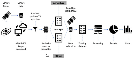 Accord to the methodology outlined as a flowchart in Figure 3, a large amount of random Pixels Time Series (PTS) were extracted from each studied area to achieve of confidence level, with 17,000 points for each dataset, and 5 datasets per state. PTS values were extracted as vectors and stored as .csv (Comma Separated Values) files using a expert system created for this purpose. Each vector contained the pixel position, EVI raw data as time series values, and calculated computational distances, with similarity metrics proposed. The data were then pre-classified into two large groups, Agriculture and Others. Agriculture was the target group, which expected areas with high spectral dynamics level, and the Others group contained lower dynamics level areas. Each experiment used 20% of data set for training.