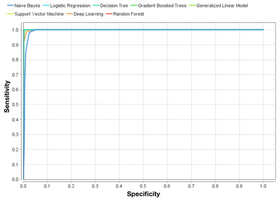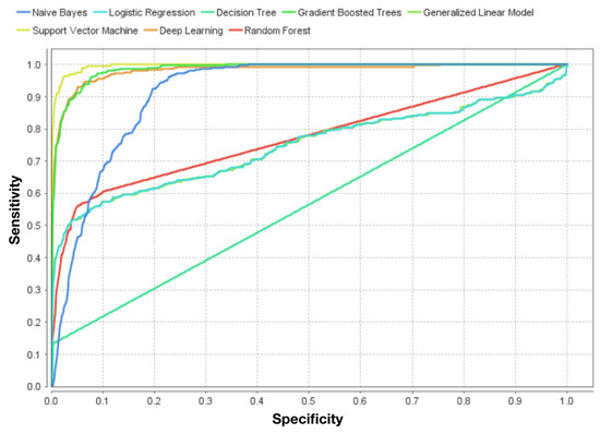 ROC—Classification process effectiveness—Data witout similarity metrics on the data set. Comparison—Naive Bayes, Logistic Regression, Decision Tree, Gradient Boosted Tree, Generalized Linear Model, Deep Learning, Random Forest.
