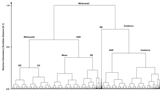 The hierarchal clustering analysis below, Figure 6, put in evidence the hierarchal importance of each metric for the process. The relevance of each attribute is calculated accord to Shannon information and the normalized score is represented hierarchically. The Minkowski distance played a key part in the classification process and demonstrated to be very representative of the target class, highest score. Canberra distance, Standard deviation, Mean, Coefficient of Variation, and Variance were also very relevant in the high score process, but not as decisive. The removal of the Manhattan distance, Sum, Median, and Difference had no impact on the process accuracy.