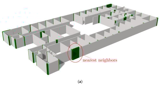 The first step of the topology adjustment is creating an adjacency graph between neighboring partials wall axes based on the shortest Euclidean distance between the geometries. To determine which wall axes to connect, a set of seed points are established (Figure 3a). Each endpoint of a wall axis is considered a seed if it does not also belong to another wall axis. For a seed of a wall axis , the wall axes are found so that each axes contains a point that lies within a user defined threshold distance of (Equation (1)). This Euclidean distance is set equal to the maximum gap a wall is allowed to span over to make a connection and is considered application dependent.