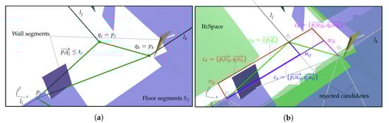 For every defined by , the best suited connection to one of its is determined by minimizing the extrapolation of the wall axes that is not supported by observations (Figure 3c). As such we define a cost function based on the connection’s length and type (Equation (5)).