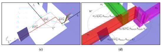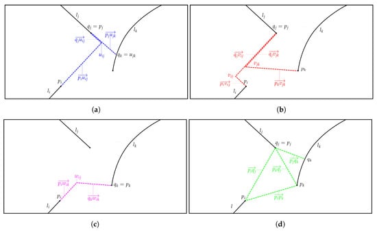 where , and are the intersection points of respectively the functions themselves, their normals at and and their combinations. We combine the connections in an upperstrict manner so that the extension of can also intersect with the normal of and vice versa. The result is a set of vector pairs between and its neighboring wall axes (Equation (3)).