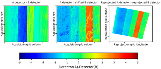 The reprojected detectors (right image) map then correspond to the “shifted” differences (middle image) except slightly at the left border of camera 1 but with a difference of only one detector shift. This means that the L1B geolocation matches OLCI-A and OLCI-B as it independently matches each sensor with the ground. Moreover, the map of the differences between reprojected detectors (right) is more homogeneous due to the sole use of geometrical information, which shows that using reprojection is also preferable.