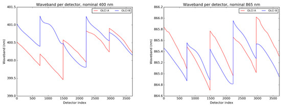 The OLCI spectral requirements drive the instrumental design to provide measurements at the nominal wavelengths detailed in Table 1 with a fine spectral resolution. By design, a spectrometer is subject to slight shifts of the wavelength of acquisition across the field-of-view, an effect called “smile” (see [12] for MERIS). Spectral characterisations of OLCI-A and OLCI-B exhibit small differences as shown in Figure 3 (absolute values for both sensors) for bands Oa01 and Oa17 (all other bands providing qualitative similarities) and (differences between the two sensors) in Figure 4 for all bands per detector. Data from each camera of 740 detectors is aggregated to the previous and succeeding ones (if any) using a continuous detector index. At 400 nm, the differences are the strongest with up to about 1 nm difference in camera 2.