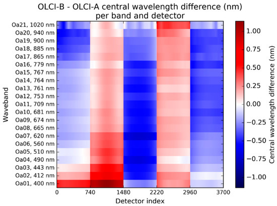 OLCI-B – OLCI-A central wavelength difference (nm) per waveband and detector.