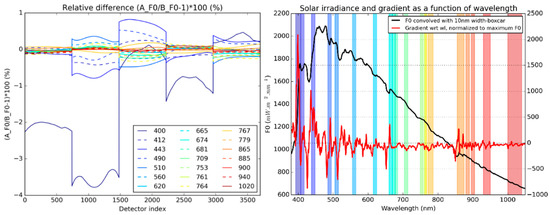 Relative difference error between OLCI-A and OLCI-B radiometry from the solar illumination factors (left). All bands represented from 400 nm (deep blue) to 1020 nm (deep red). Solar irradiance convolved with a 10 nm boxcar filter and gradient (right).